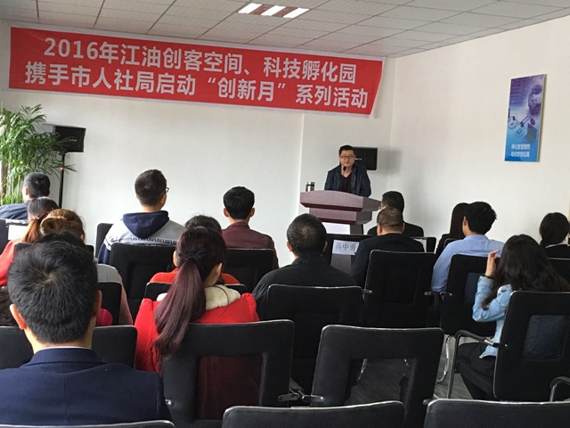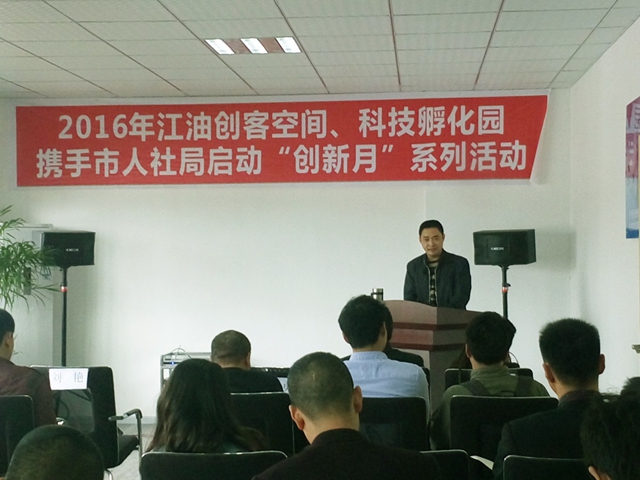 2016年4月8日,江油市創(chuàng)客空間和科技孵化園攜手市人力資源和社會保障局舉辦“創(chuàng)新月”政策培訓會,參加培訓會的有市人社局人才中心主任蒲益、副主任郭建華、股長蔣紹富、股長劉光勇以及創(chuàng)客空間和科技孵化園的入孵企業(yè),培訓會由創(chuàng)客空間經(jīng)理鮮曉波主持。